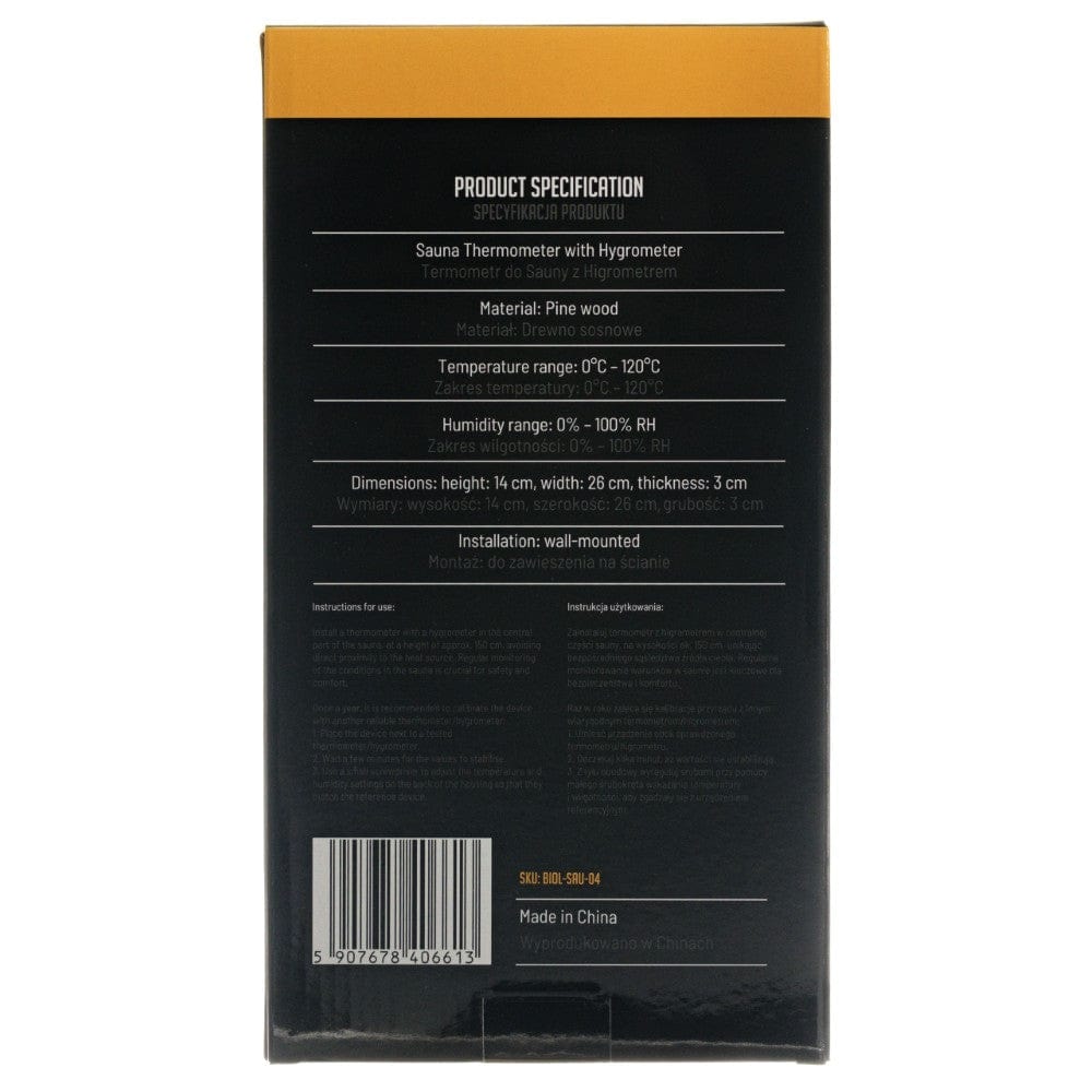 The sauna thermometer with hygrometer by Bilovit is an essential device for anyone who cares about comfort and optimal conditions during a sauna session. Made of light-coloured pine wood, it does not heat up, making it ideal for installation in saunas. The thermohygrometer is equipped with two precise clocks that clearly display the current temperature (from 0 to 120 degrees Celsius) and humidity (from 0 to 100%), allowing you to have full control over the conditions inside the sauna. Thanks to its minimalist design, it fits perfectly into both modern and traditional sauna interiors.