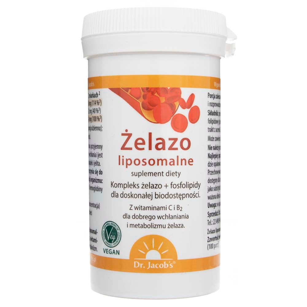 Dr. Jacob's Liposomal Iron is a powdered dietary supplement containing not only liposomal iron, but also vitamin C which enhances iron absorption, and vitamin B2 supports proper iron metabolism.