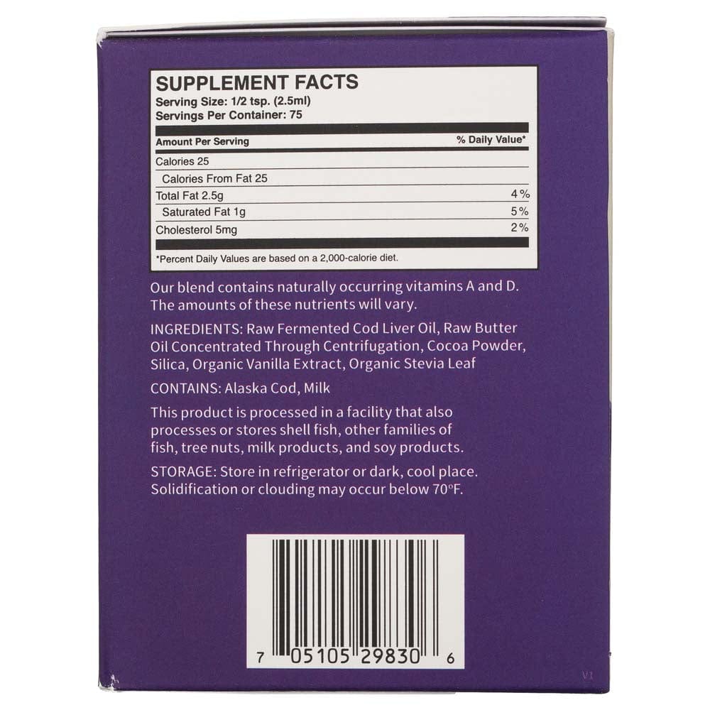 Raw Fermented Cod Liver Oil, Raw Butter Oil Concentrated Through Centrifugation, Cocoa Powder, Organic Vanilla Extract, Silica, Organic Stevia Leaf.