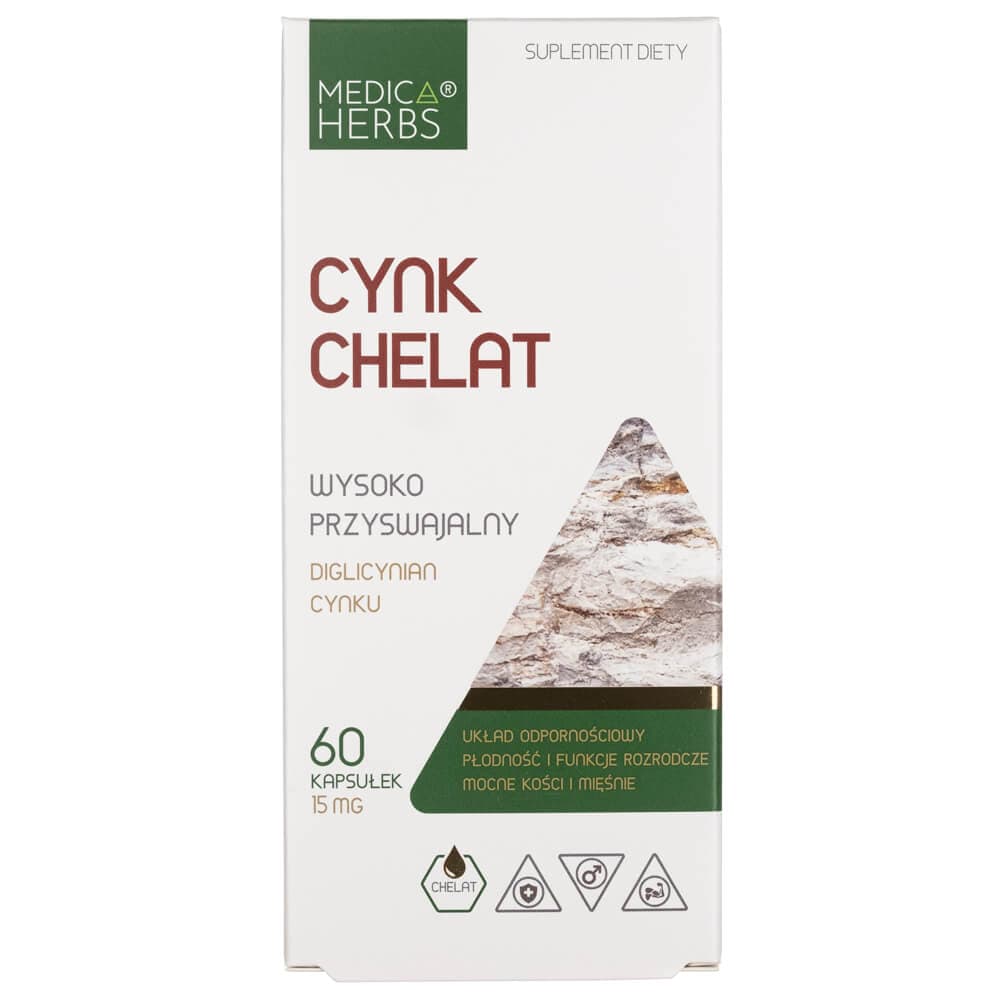 Zinc Chelate is a dietary supplement in capsule form from Medica Herbs, which contains zinc diglycinate. Zinc in chelate form is highly absorbable and well tolerated by the body.