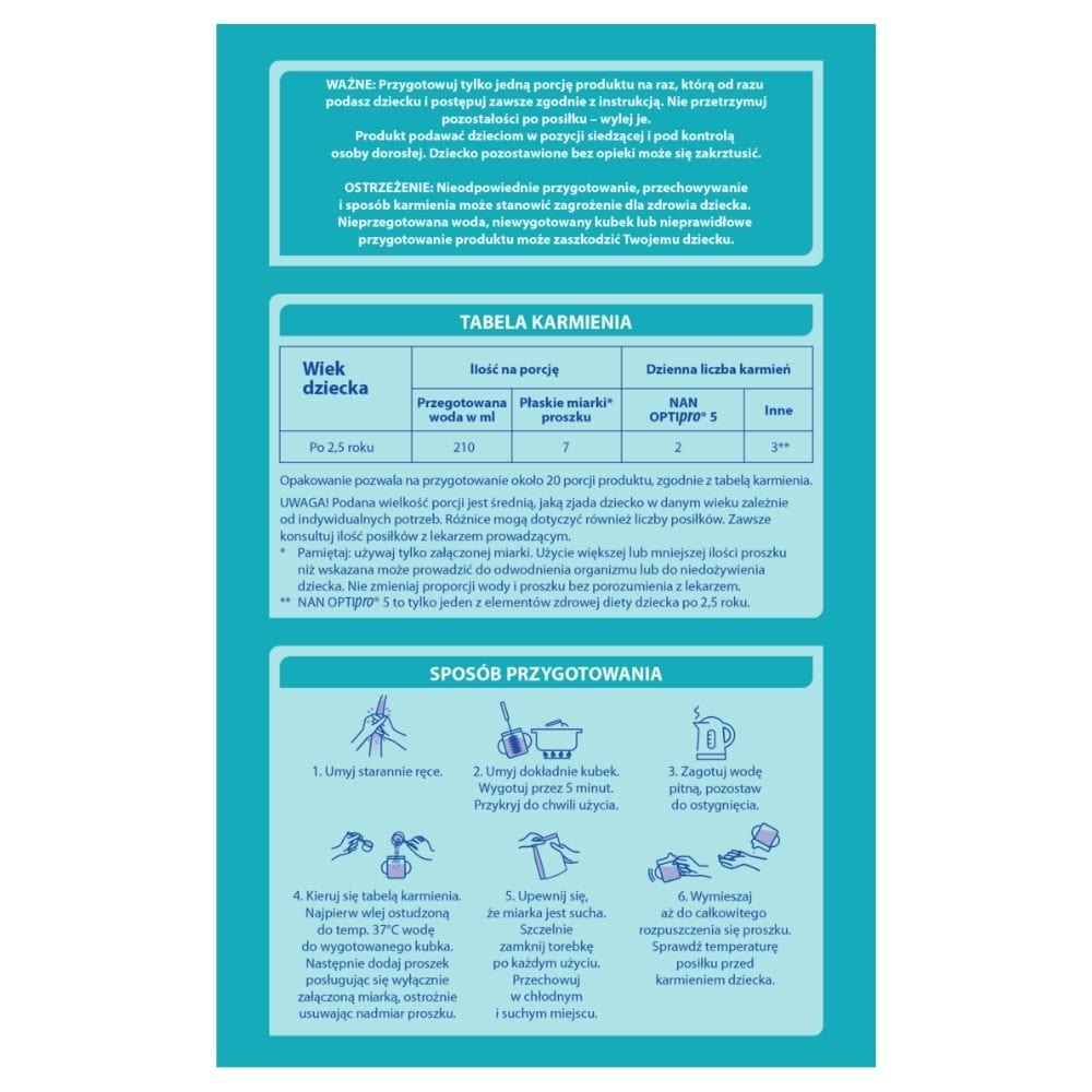 Nestle NAN OPTIpro 5 is a milk-based product intended for young children over 2.5 years of age. Enriched with vitamins and minerals. It is not a substitute for breast milk, but a product designed to facilitate the proper composition of a child's diet.