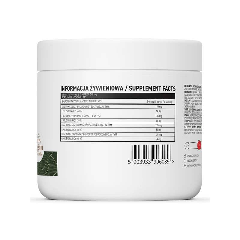 OstroVit Quatro Mushroom Blend Vege is a unique combination of extracts from four different mushrooms - yellow lacewing, coneflower, Chinese mace and subclavian spinneret. It is a preparation available in a convenient powder form, created for people who care about supplementing their diet with natural, valuable ingredients. The preparation is vegan, without unnecessary additives.