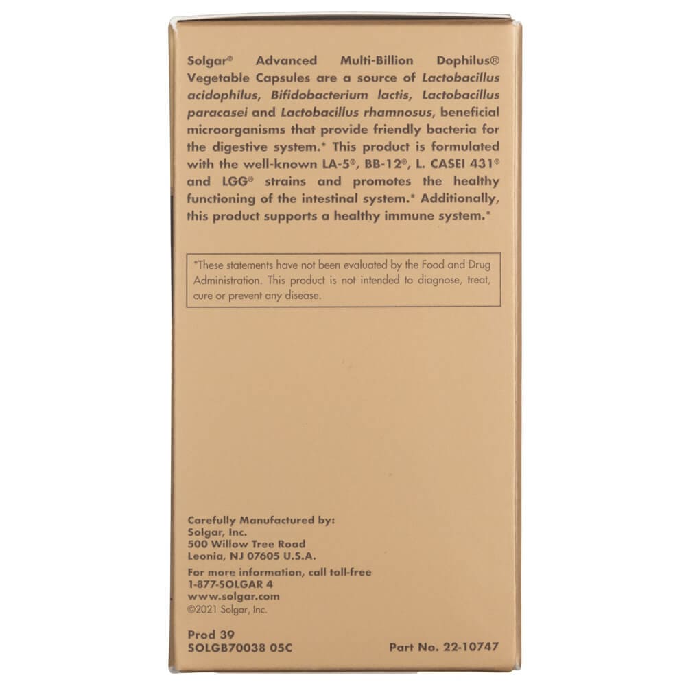 Solgar® Advanced Multi-Billion Dophilus® Vegetable Capsules are a source of Lactobacillus acidophilus, Bifidobacterium lactis, Lactobacillus paracasei and Lactobacillus rhamnosus, beneficial microorganisms that provide friendly bacteria for the digestive system. This product is formulated with the well-known LA-5®, BB-12®, L. CASEI 431® and LGG® strains and promotes the healthy functioning of the intestinal system. Additionally, this product supports a healthy immune system.